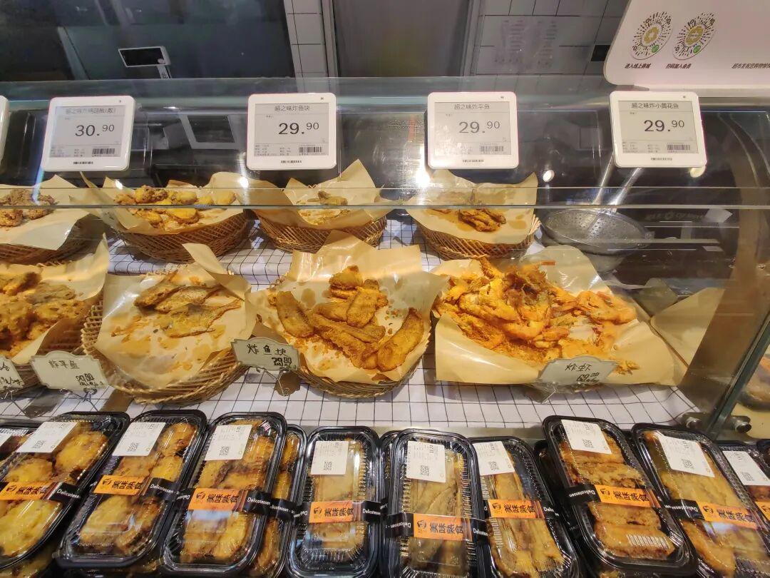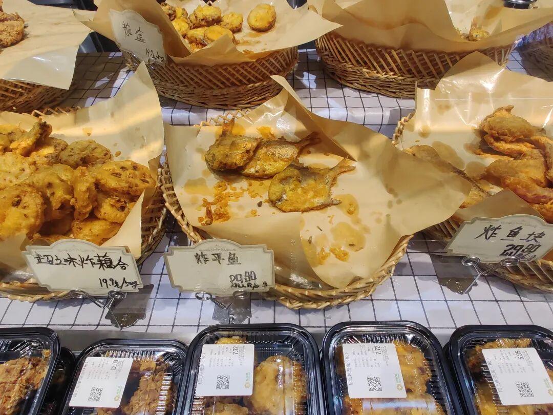 下面几张图是北京超市发的炸物柜台,是为数不多的有专门炸物柜台的超市。该炸物柜台主打除了炸鸡之外,还包括几款水产品:炸小黄鱼、炸平鱼(银鲳)、炸鱼块、炸虾、炸藕盒,金黄酥脆的炸物可以非常强烈地勾起消费者的馋欲,是现场场景化销售的利器。