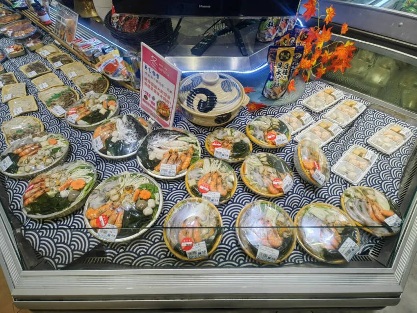 比如说华堂的海鲜火锅部门(下图),主打的是各种冰鲜鱼片、冰鲜虾滑、冰鲜鱼丸,场景化非常明显!