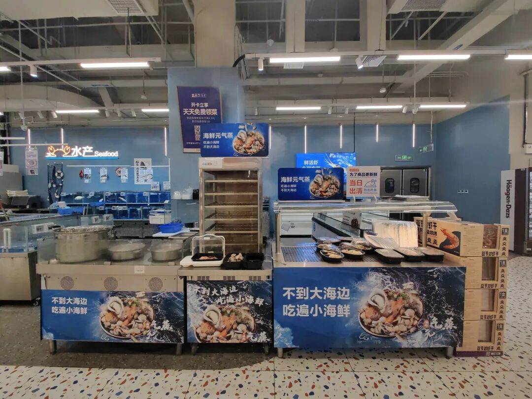 盒马门店同时还配备的现场蒸海鲜的器具,口号是:海鲜元气蒸、不到大海边,吃遍小海鲜,也是典型的适合新中产和Z时代的强消费场景。