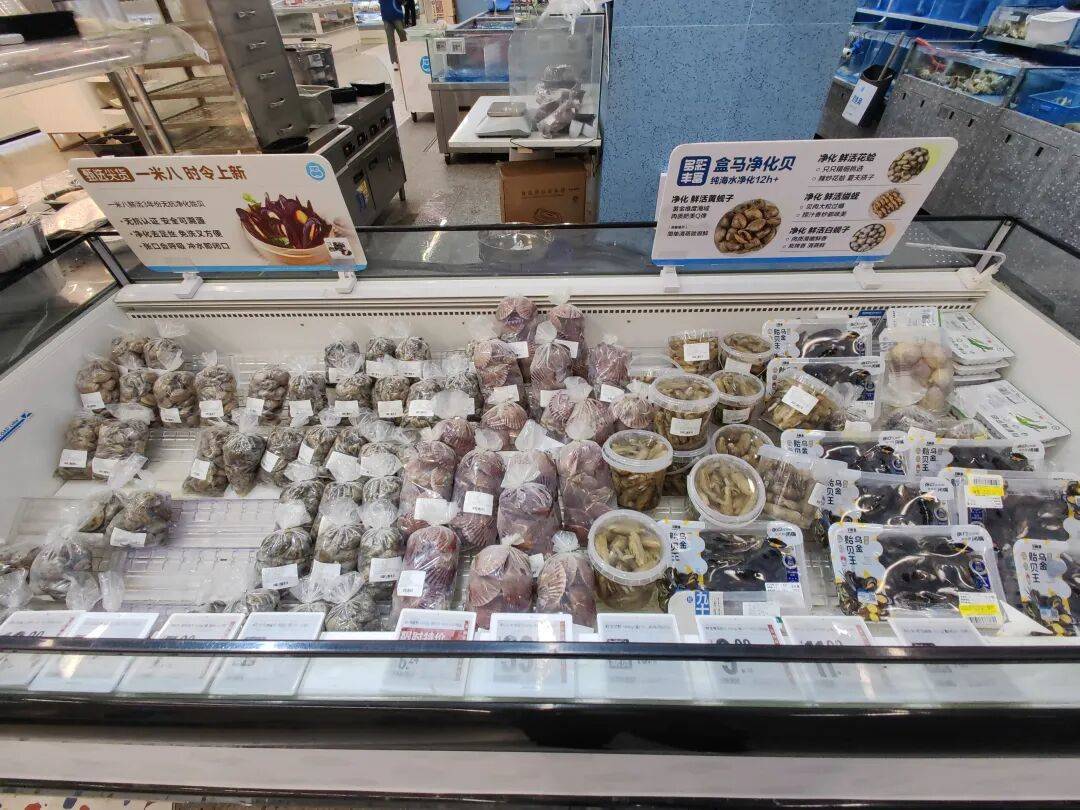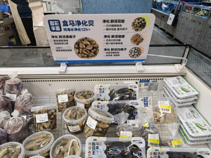 比如盒马的清蒸海鲜部门(下图),就主打净化贝类,关键词是纯净海水净化12小时,主打产品包括:鲜活花蛤、鲜活缢蛏、鲜活黄蚬、鲜活白蚬、鲜活扇贝等。