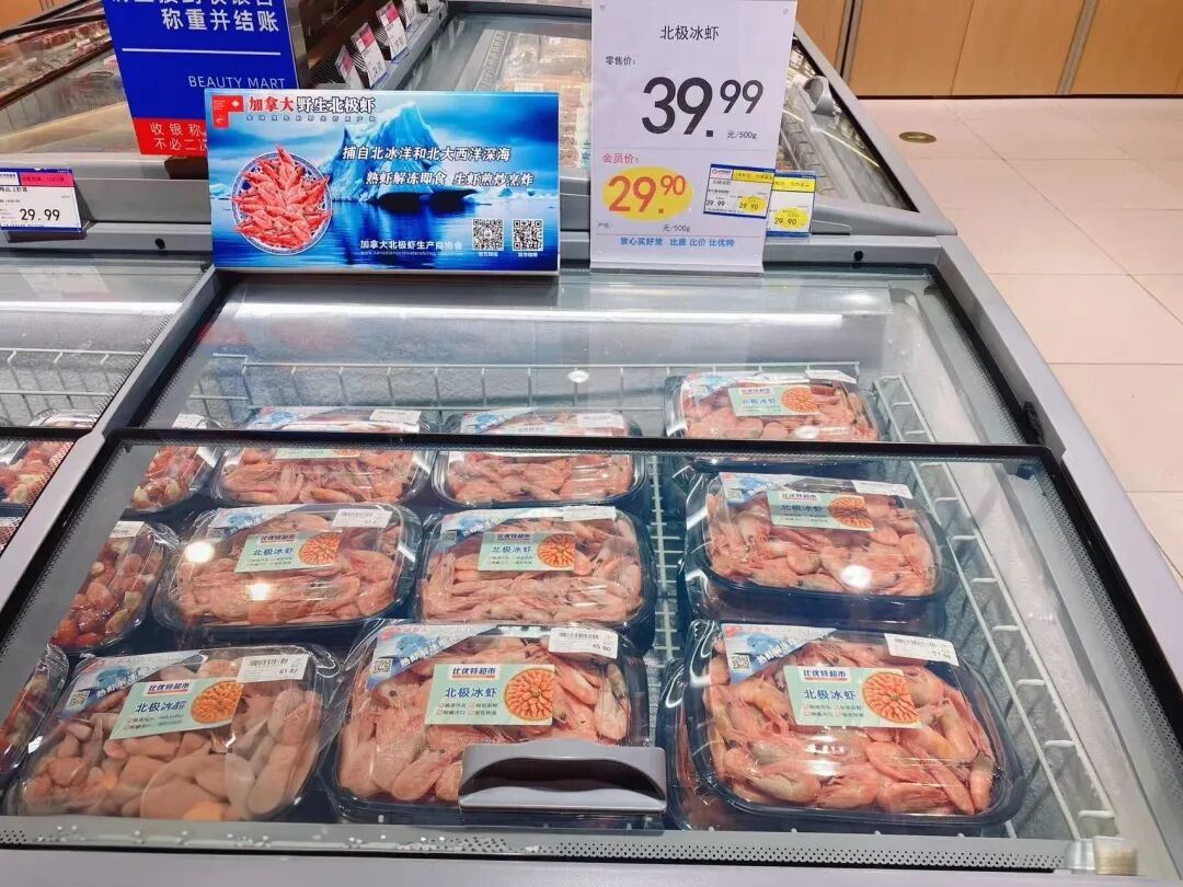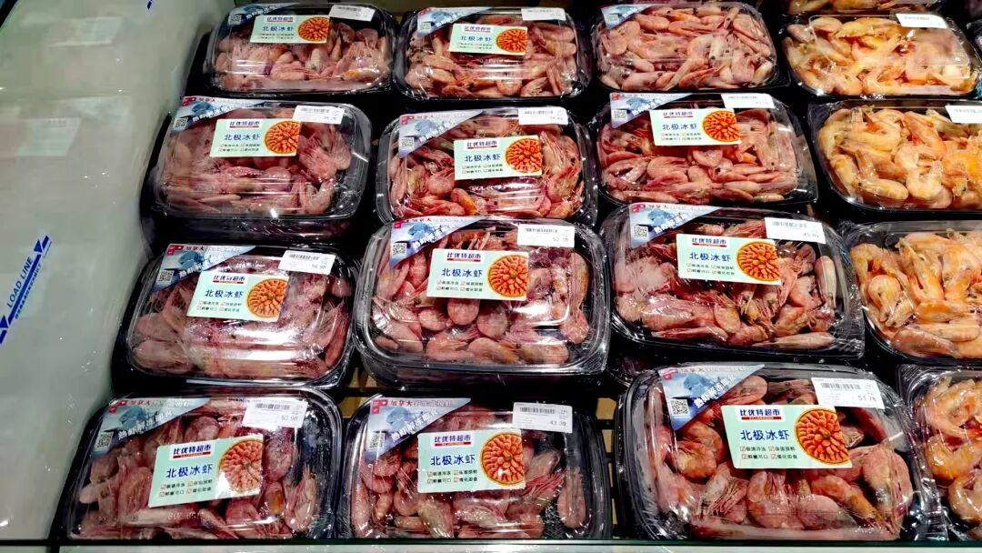 比如包装的透明化:下图是比优特超市的散装加拿大北极虾包装陈列。现在的消费者越来越喜欢直接看到包装盒里面的产品,对于只是在包装盒上印上产品照片已经不再满足。我们建议供应商今后应该更多提供透明包装盒或半透明包装盒给超市,可以在包装盒外面贴上产品Logo或品牌Logo。