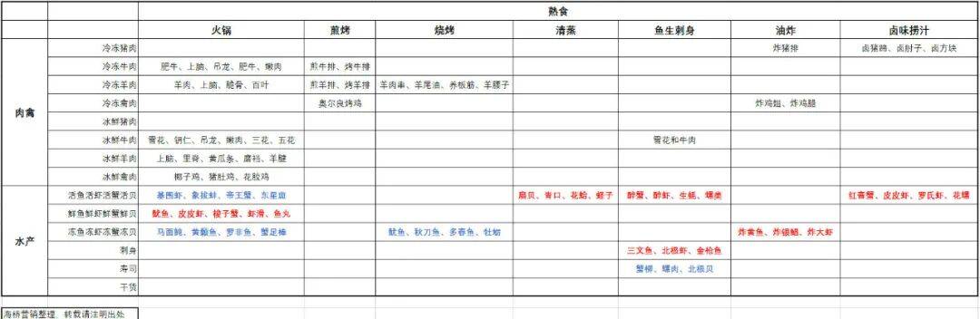 如果我们把超市的场景化,按照肉禽、水产、熟食等部门,重新打碎组合,就可以得到下面这个有趣的表格: