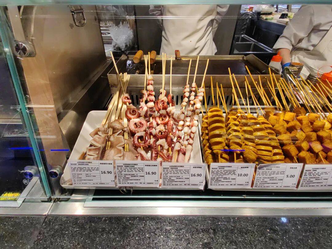 下图是物美超市的铁板烧柜台,虽然面积不大,但也很有特色。各种铁板鱿鱼串把夜市和排档等年轻人的热门消费场景带入超市卖场,也是一种大胆的尝试。