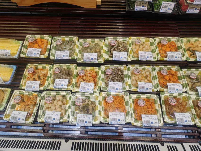 日本的饮食文化,与福建和潮汕地区的饮食文化有很多相似之处,都是沿海地区的海洋饮食文化。目前超市的生腌水产系列,做得比较不错的还是日式超市。下图是华堂超市的生腌小海鲜系列,包括:芥末章鱼、芥末螺片、麻辣扇贝、麻辣贻贝、照烧扇贝、藤椒鱼皮、藤椒鱿鱼,使用的食材多是章鱼鱿鱼等软体类和扇贝海螺等贝类。