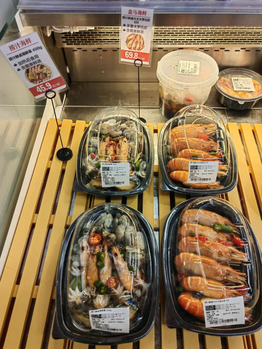 捞汁海鲜是近年新兴的海鲜消费场景,盒马推出的捞汁鲜卤海鲜荟、捞汁鲜卤罗氏虾,都带有浓厚的泰式捞虾风格。其中罗氏虾就是在泰国等东南亚国家非常流行的水产食材,罗氏虾、八爪鱼、花蛤的组合也是当下流行的组合。