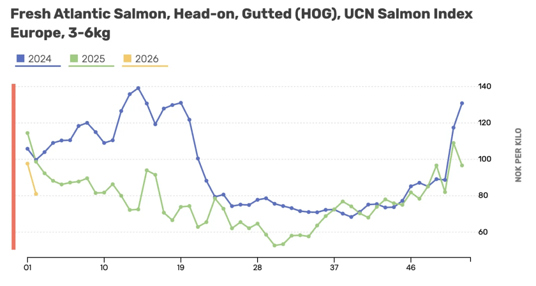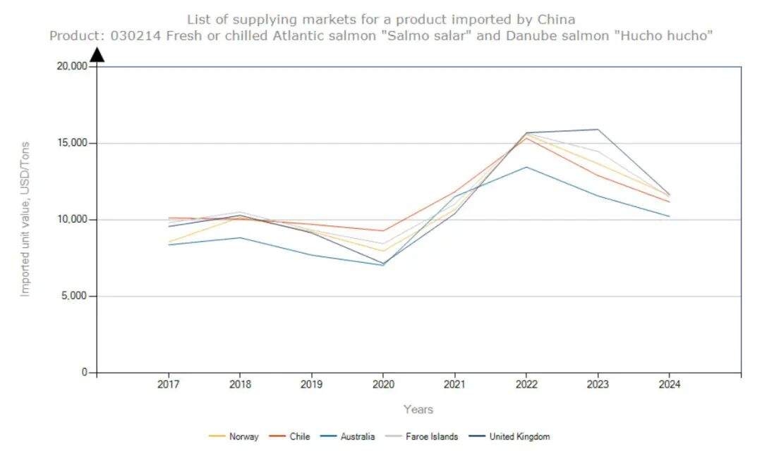 从下图可以看出:2024-2026年期间,国际市场冰鲜三文鱼的价格持续下跌,2026年初又再次创下近年历史新低!近两年国际市场三文鱼价格跳水,主要原因还是供过于求,部分原因是美国市场因为增加关税导致需求萎缩,欧洲市场停滞不前。