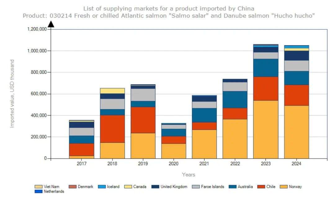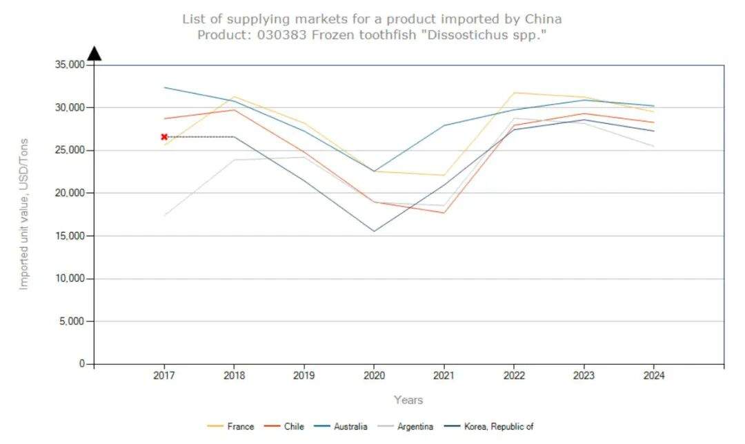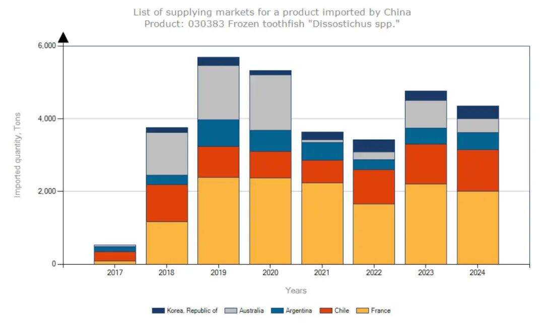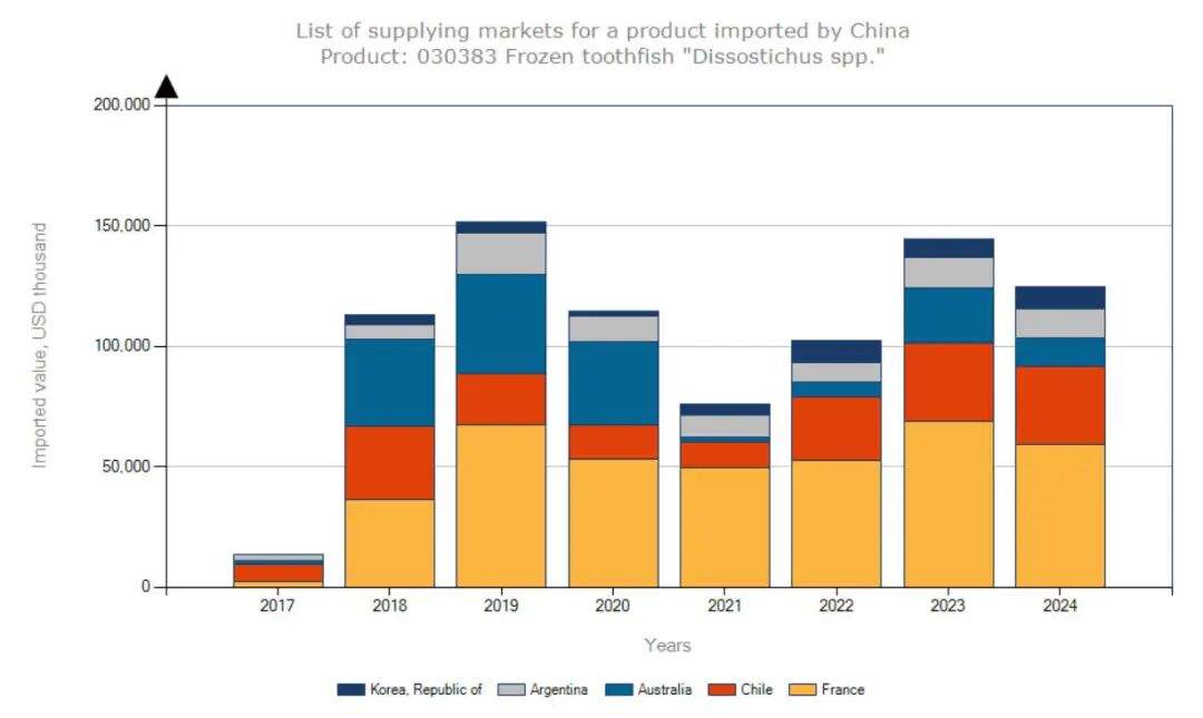从冷冻银鳕鱼的进口额看:法国和智利的进口额最大,其次是澳大利亚、阿根廷和韩国。中国银鳕鱼进口额最高时是2019年的1.50亿美元,2021年进口额最低时是7500万美元,2024年进口额为1.25亿美元。