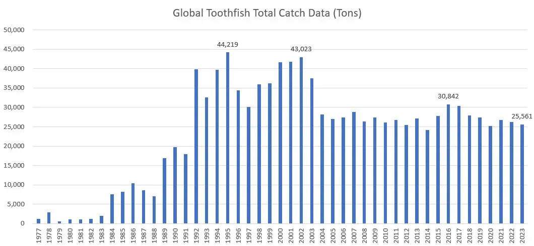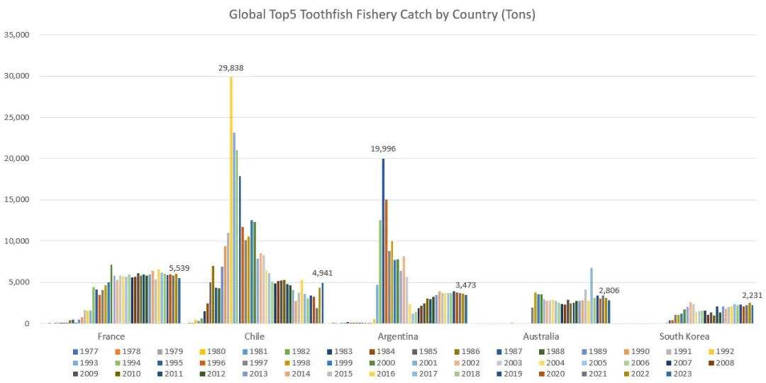 银鳕鱼是国际公认的高端野生海鱼,而且生长非常缓慢,资源恢复缓慢,全球产量有限。全球产量最高峰时只有4.4万吨(1994年),2023年全球产量为25,561吨,其中法国5,539吨、智利4,941吨、阿根廷3,473吨、澳大利亚2,806吨、韩国2,321吨。