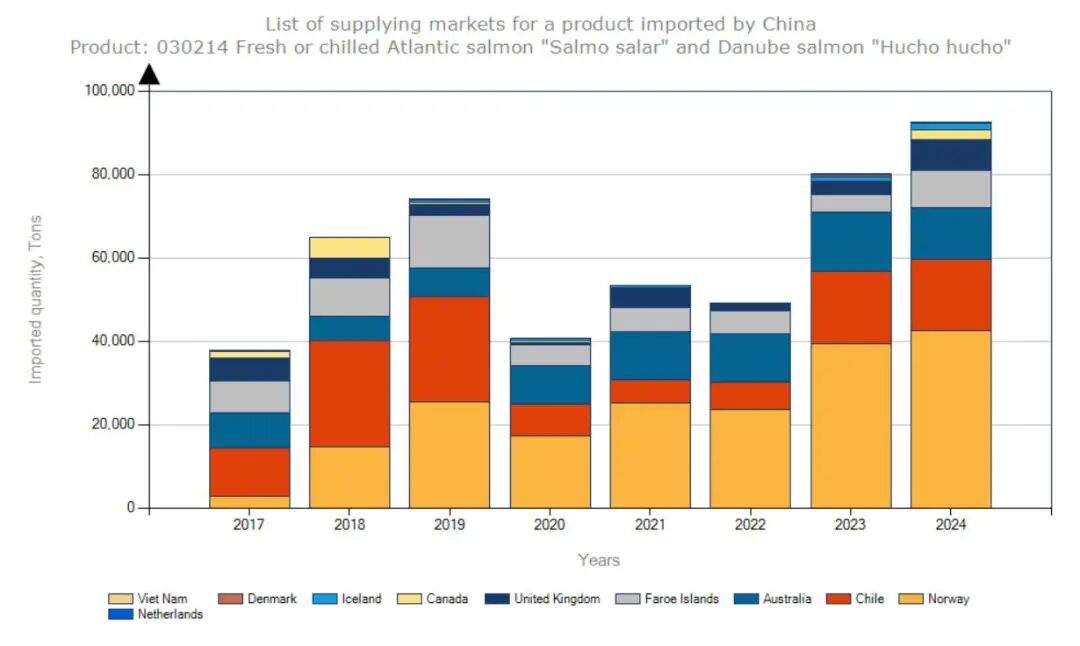 从冰鲜三文鱼进口额看:2020年最惨,因为新冠疫情叠加新发地市场三文鱼事件,中国冰鲜三文鱼进口量价齐跌,只有3亿美元多;2021-2022年虽然进口额没有增长多少,但因为价格增长,导致进口额分别为上涨到6亿美元和7.5亿美元;2023、2024年进口额分别为10.5亿美元左右,2025年进口额有望突破13亿美元。