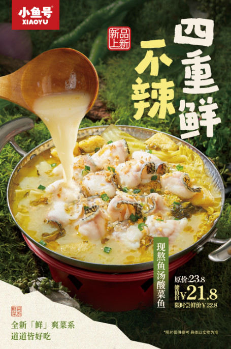 「现熬鱼汤酸菜鱼」不辣风味的推出,精准回应了市场对「“不辣”且好吃味够营养健康性价比高」的产品真实又极致的需求,小鱼号花费很多的时间心力做升级做味型投入产品研发,核心目的就是让为了更多的消费者,能够在小鱼号无负担地享受,一碗好鱼汤做出的美味酸菜鱼!