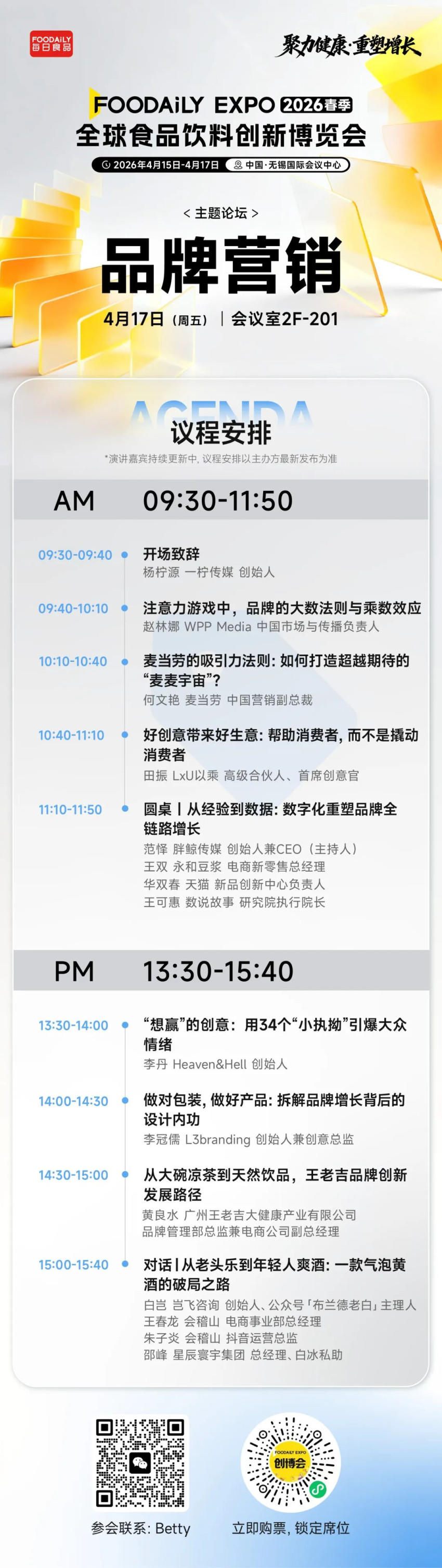 这里有通用磨坊、宾堡中国、雀巢、麦当劳、百事亚洲研发中心等国际巨头顶层战略与本土化策略分享;有飞鹤、诺特兰德、周黑鸭、盼盼集团、五芳斋、广州酒家、旺旺爱至尊、王老吉、盐津铺子等国民龙头品牌,持续增长创新的实战拆解;更有轻上、乐源健康、齐赞、波比艾斯、三诺健康、维果清、别样泡泡、会稽山、品斛堂、臻牧、丰草牧场、糖友厨房、神探伍伍等赛道黑马,带来亿级爆品的全链路复盘,现场还原从细分赛道破局、实现逆势增长的核心逻辑。