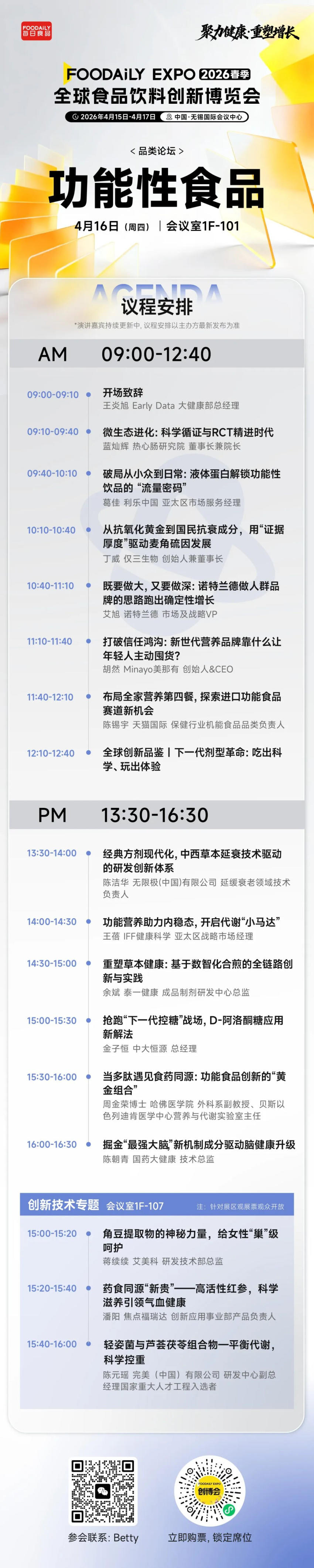 这一次,我们以“创新会议+创新品鉴+创新奖项”三大核心内容组成的「全球创新博览」,搭配全新升级的「未来健康食品生态展」,全方位融合产业顶层思想、全球创新灵感与标杆品牌实战案例,为你完整呈现全球视野下,食品健康化、功能化系统升级的全景蓝图。