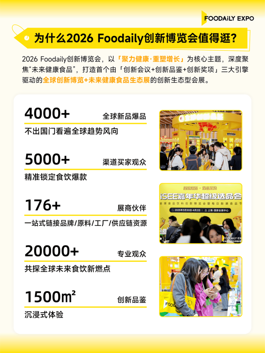 2026年4月15日-17日,中国·无锡国际会议中心,第十一届Foodaily 全球食品饮料创新博览会,以「聚力健康・重塑增长」为主题,为您带来这份关于创新增长的“确定性答案”!