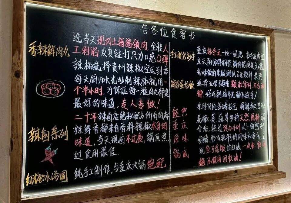 深圳的笑财重庆原味火锅,将自己的真诚安放在顾客眼前,他们将食材选材、产品研发历程都挂在墙(小黑板)上,让顾客更了解产品和品牌,吃的更放心。