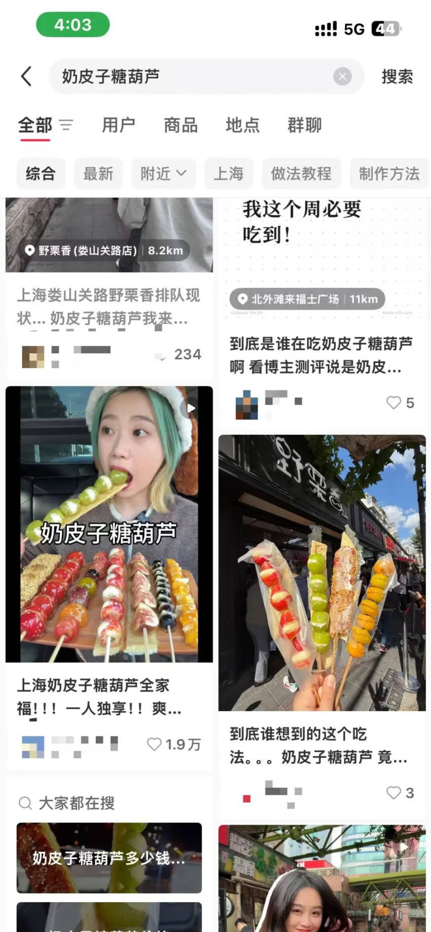 这种热度也延续到了线上,蓝鲸新闻记者检索发现,奶皮子糖葫芦相关话题在抖音播放量破亿,小红书上光笔记就十几万篇,几乎只要把奶皮子糖葫芦的图片摆在首页就意味着点击量。