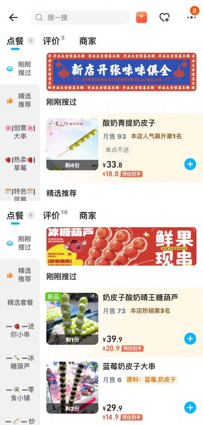 蓝鲸新闻记者查询发现,目前这一品类中最热门的单品是“晴王酸奶奶皮子糖葫芦”,但单价基本都在30元以上,甚至有门店卖到60元。即便价格如此高,但依然供不应求,蓝鲸新闻记者通过外卖平台查询多家门店相关产品即将售罄。