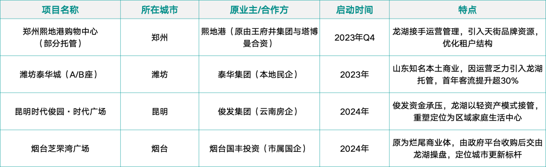 龙湖的轻资产输出加速,2023–2024年,龙湖新增轻资产项目超20个,近几年部分项目列表如下: