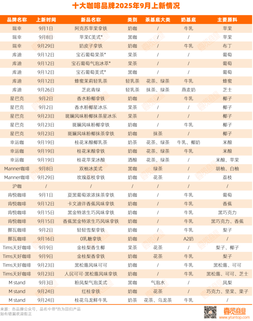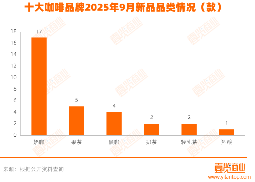 咖啡新品同样呈现出厚重化倾向,奶咖类产品成为推新重点。9月,咖啡品牌共推出17款奶咖新品,占当月咖啡新品总量的54.8%,同期果咖与黑咖的新品数量分别为5款和4款。