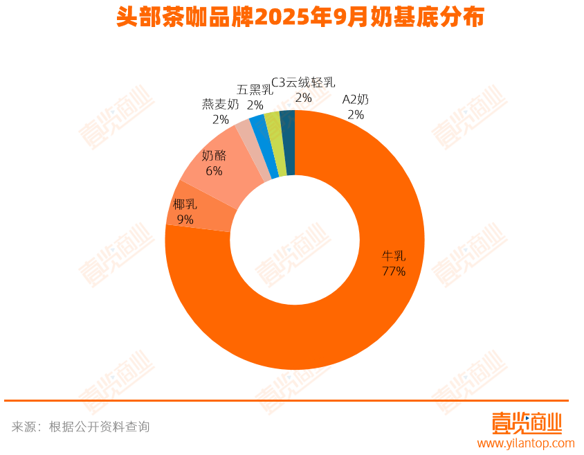 从奶基底看,牛乳仍然是经典且普遍的选择,共计使用了40次,占比77.0%;其次为椰乳,占比9%。此外,在本轮上新中,酸奶基底并未被使用,或许反映出品牌在秋冬产品线上更倾向于浓郁、醇厚而非清爽的质地。