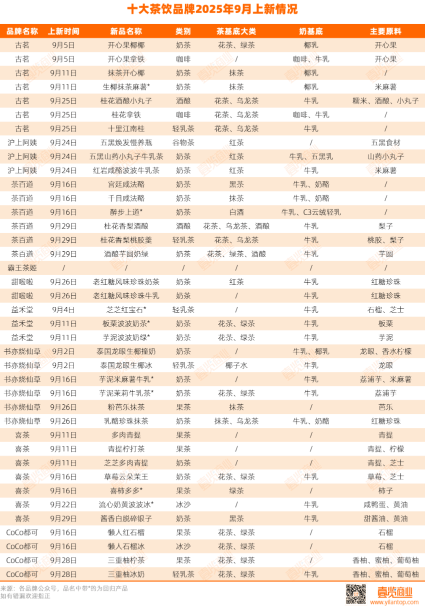 茶饮品牌中,古茗和喜茶在9月并列上新数量榜首,各自推出7款新品;茶百道和书亦烧仙草紧随其后,均上新6款。整体来看,主流茶饮品牌在秋季仍保持较密集的产品更新节奏。