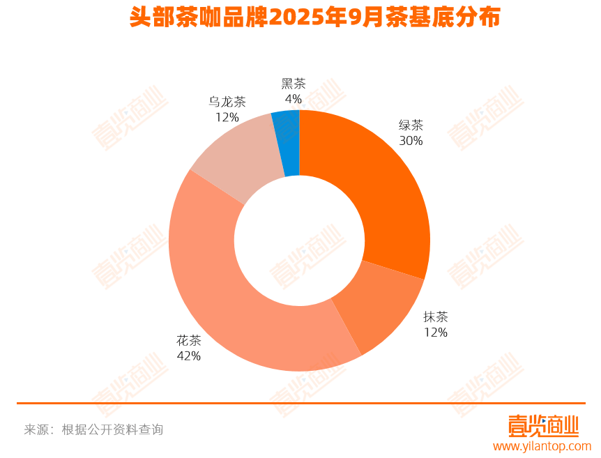 9月,茶咖品牌们选用了5款茶底,其中,使用最多的仍为花茶,其次是绿茶,使用最少的是黑茶。