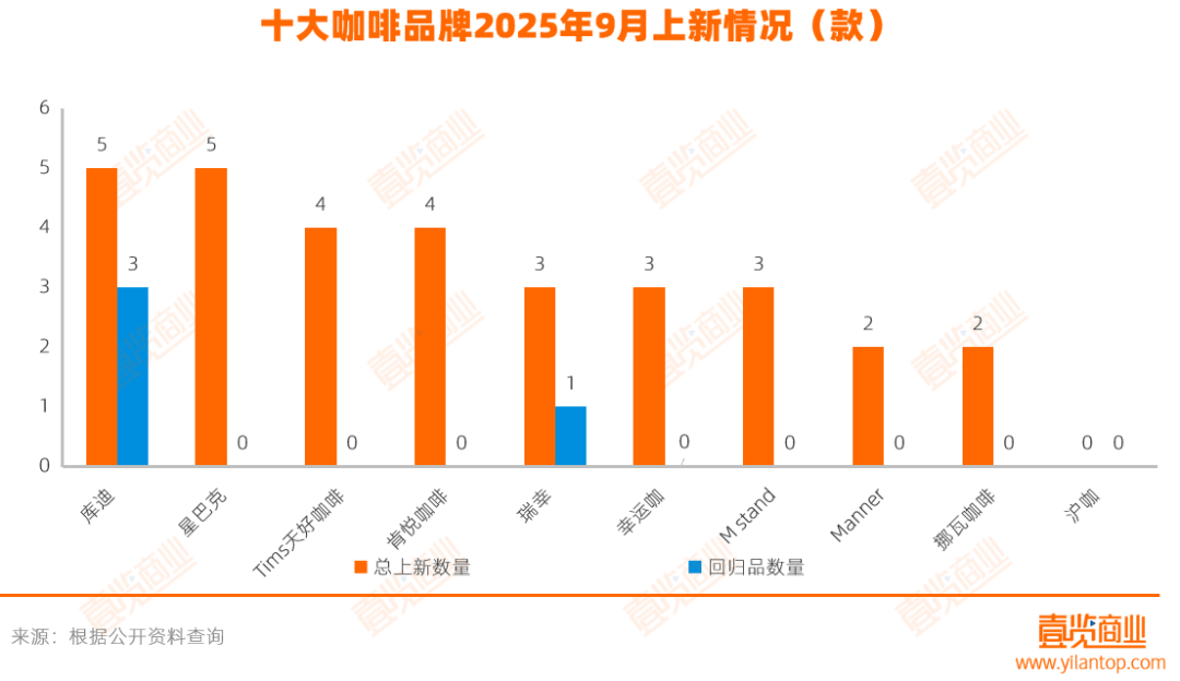 咖啡品牌中,库迪和星巴克上新最为活跃,各有5款新品上市;Tims天好咖啡与肯悦咖啡并列其后,分别推出4款新品。其他咖啡品牌在9月也保持了稳定的推新频率,上市2至3款不等。