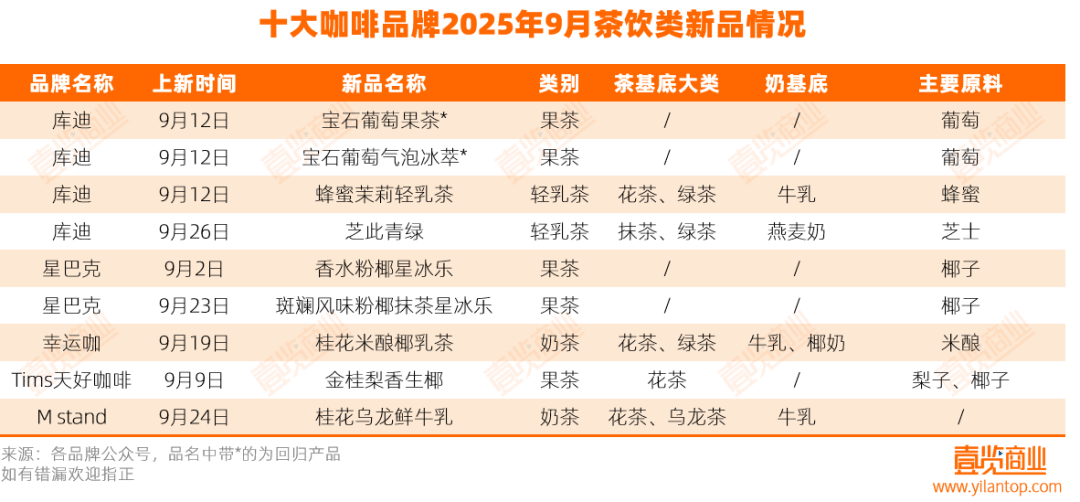 专业咖啡品牌也在加速布局茶饮领域,9月共由5个咖啡品牌上新9款茶饮类产品,其中库迪推出4款,占其9月新品总数的80.0%;星巴克上新2款星冰乐;幸运咖、Tims天好咖啡与M stand各推出1款茶饮新品。