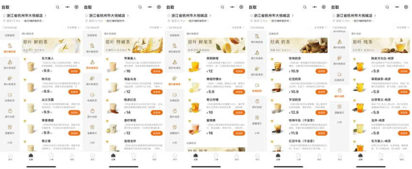 产品方面,香飘飘主打“原叶现泡”概念,从目前的菜单列表来看,有原叶鲜奶茶、原叶特调茶、原叶鲜果茶、经典奶茶、原叶纯茶五大系列,强调使用原叶茶底、新鲜牛乳,价格在5.9元到16元之间。