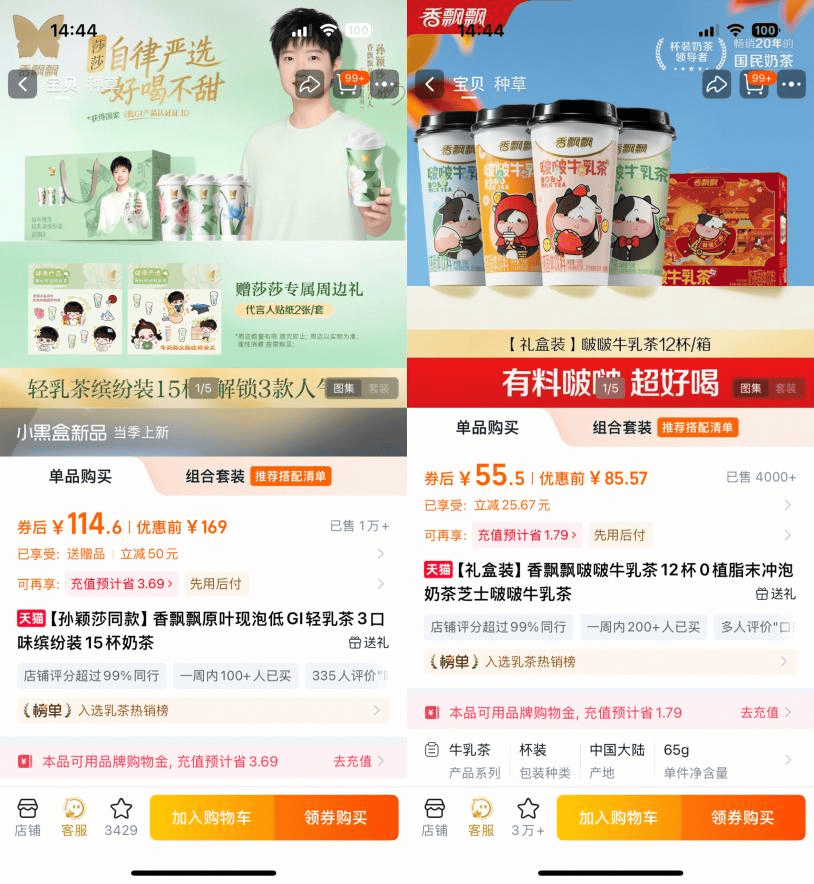 12月2日,茶咖观察在天猫香飘飘食品旗舰店看到,“【孙颖莎同款】香飘飘原叶现泡低GI轻乳茶缤纷装15杯”优惠前价格为169元,券后价格为114.6元,折算下来每杯7.64元;“啵啵牛乳茶”12杯券后价55.5元,折算下来每杯要4.625元。