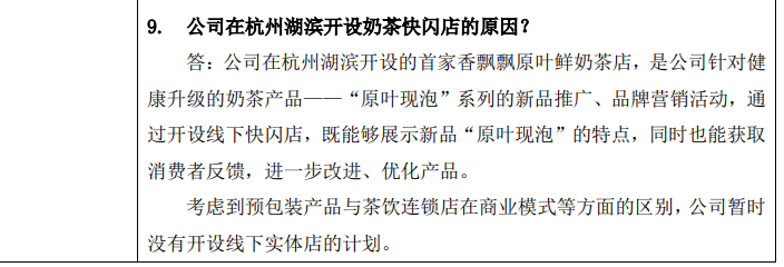 在去年开出杭州快闪店后,香飘飘曾如此回复关于未来是否会入局线下茶饮的问题:公司暂时没有开设线下茶饮店的计划,希望更专注于自身的优势领域,当下还是聚焦在预包装产品的研发、销售上。
