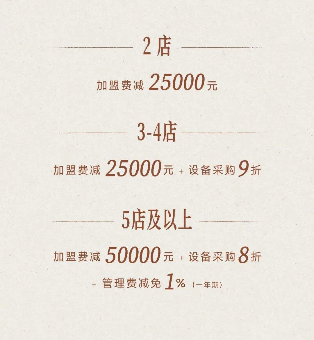 一是开多店阶梯优惠。加盟商开设第2家门店,单店合作服务费减2.5万,相当于打5折;第3-4店在单店合作服务费打5折的基础上,设备费用打9折;若开设第5家及以上门店,单店合作服务费全免,设备费用打8折,开店第一年的管理费用减1%。