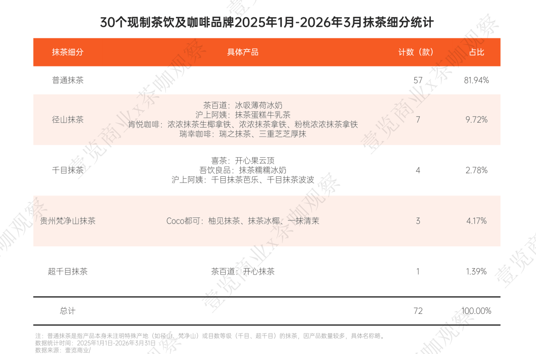 在品质分级上,喜茶、茶百道、沪上阿姨等品牌已明确标注“千目”“超千目”等细度等级,与此同时,品牌对抹茶原料品质的追求也在升级。尽管普通抹茶仍占据81.94%的大盘,但高端化、产地化的新品正在加速抢占市场。