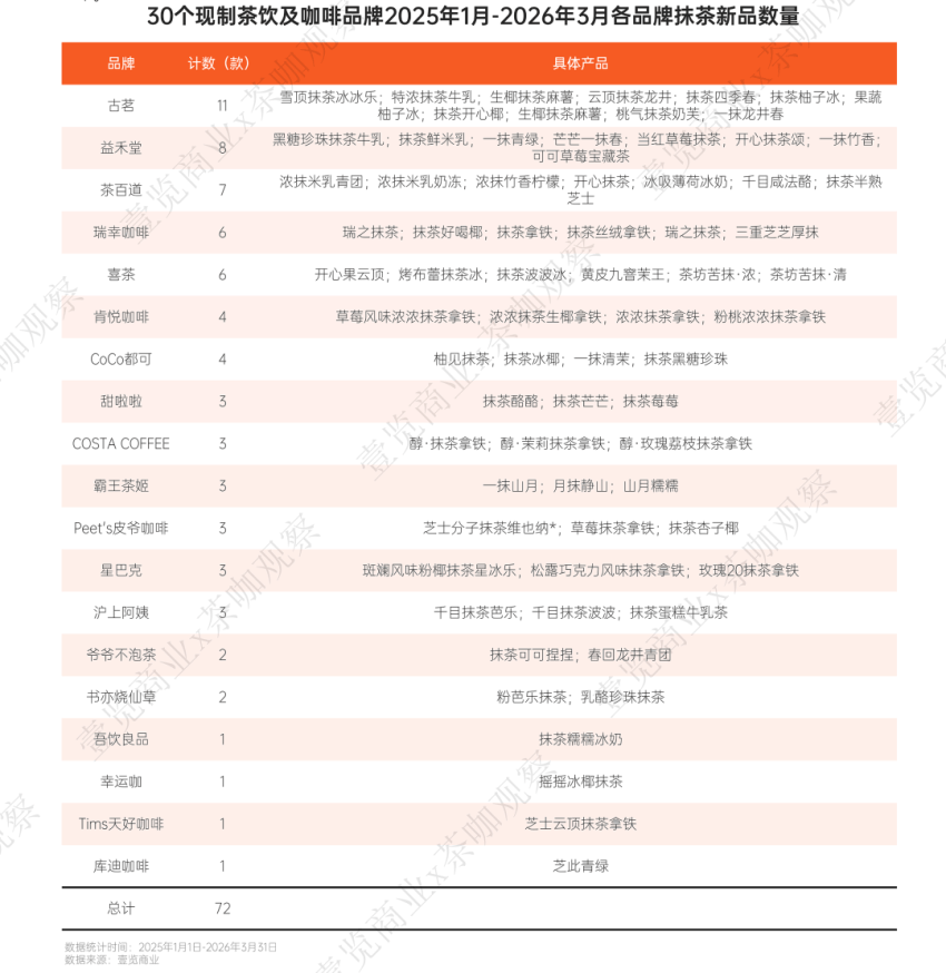 壹览商业统计,2025年1月至2026年3月,30个主流现制茶咖品牌共推出72款含抹茶元素的新品,从月度分布看,2026年3月单月上新18款,创下历史峰值。春秋两季构成两大推新高峰,显示出抹茶与季节更替、消费场景的强绑定关系。