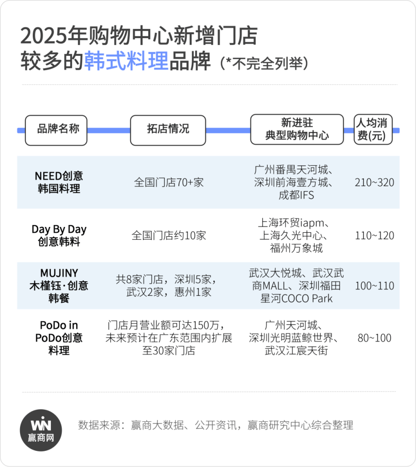 【NEED创意韩国料理】【Day By Day创意韩料】【MUJINY木槿钰·创意韩餐】【PoDo PoDo】等品牌,所到之处皆引发排队热潮,以人均百元左右价位、新奇菜品、调性体验,深受中高档商场和年轻消费者欢迎。