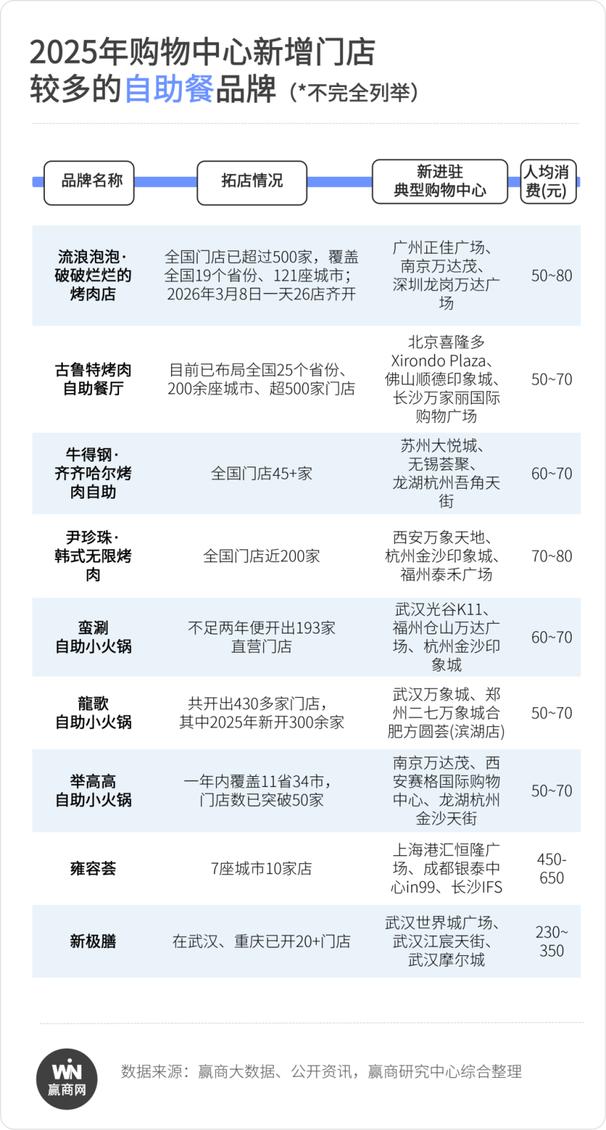 门店增速快:全国自助餐厅数量约7.5万家,近一年新开门店有近3万家,即近四成自助餐厅都是一年内刚开始营业;2025年500+优质商场内,自助餐新开店超200家,连续2年扩容。(数据来源:灼识咨询、红餐大数据、赢商大数据)