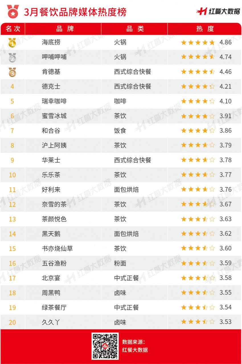 此外,本次还评选出了3月份媒体热度最高的餐饮品牌二十强。