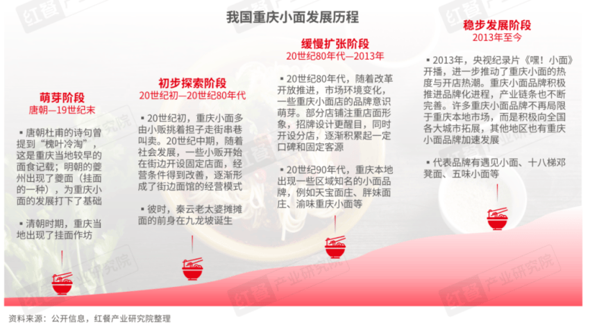 重庆小面作为重庆地区的传统美食,其发展历程可以分为萌芽期、初步探索期、缓慢扩张期和稳步发展期四个阶段。