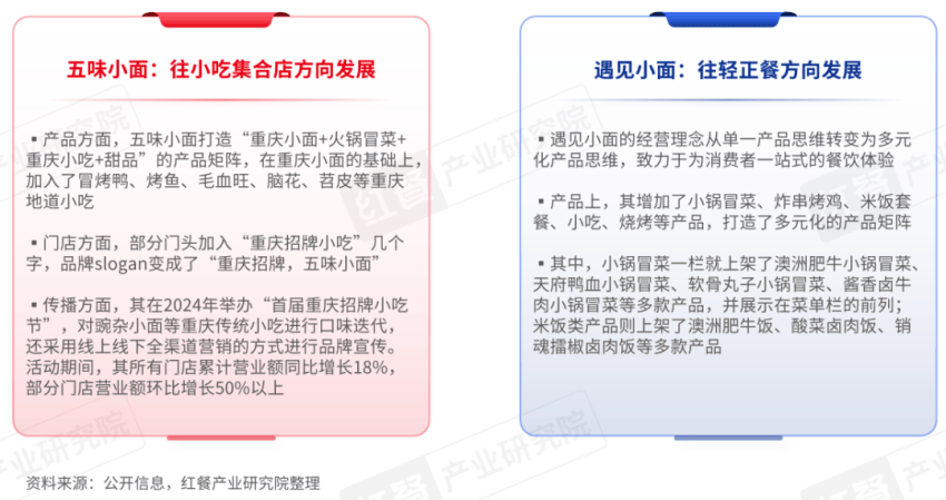 例如五味小面在部分门头上加入了“重庆招牌小吃”几个字,并举办“首届重庆招牌小吃节”,提供小吃集合店式的服务。遇见小面则瞄准聚餐、宵夜消费场景,增加了小锅冒菜、炸串烤鸡、米饭套餐、小吃、烧烤等产品,致力于为消费者一站式的餐饮消费体验。
