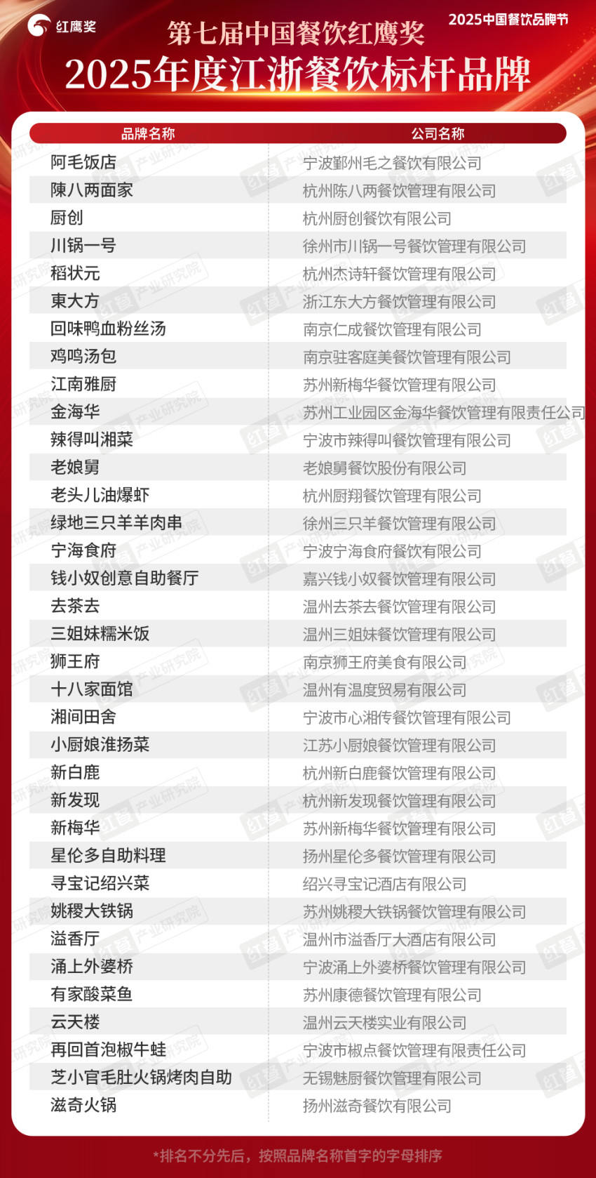 2025年9月25日,“第七届中国餐饮红鹰奖”榜单正式公布!“2025年度餐饮区域标杆品牌”作为“第七届中国餐饮红鹰奖”重要奖项之一,在上届的基础上进行了升级,对区域标杆品牌进行了更为系统、精细的分类细化,将评选的区域数量从上一届的15个拓展至20个,精准覆盖全国大部分省市及特色餐饮聚集区,力求全面挖掘不同地域的餐饮特色标杆。其中,“2025年度江浙餐饮标杆品牌”有35个品牌上榜。