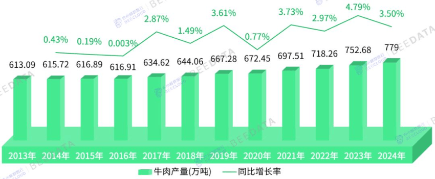 数据显示,2024年,中国牛肉产量779万吨,同比增长3.5%,牛肉消费量1070万吨,同比增长4.29%。国内市场高品质牛肉供不应求,供给端呈现韧性增长态势。