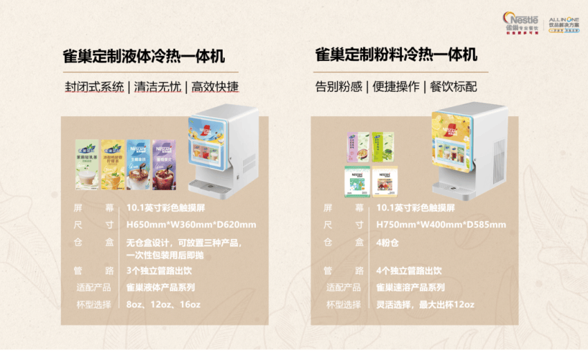 一款饮料多种杯型的配置,也免去了出饮不同杯型要额外测量的精力。“手指轻轻一点,一杯风味饮品10秒出杯”,据雀巢专业餐饮内部人士介绍,便捷、灵活的操作和多样的口味选择,也让这套饮品解决方案能够适配办公室和食堂水吧等区域,不局限于餐饮渠道的应用场景。