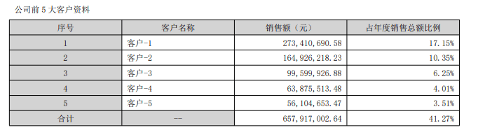 财报数据显示,去年,恒鑫生活来自5大客户的销售额达6.58亿元,占年度销售总额比例为41.27%。