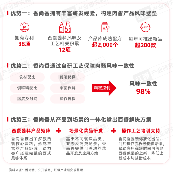 基于上述痛点,一些供应链企业积极创新并推出相应的解决方案。以在西餐酱料(尤其是意式肉酱)领域深耕超过15年的香尚香为例,其是国内较早进入西餐酱料标准化研发的企业之一,核心成员拥有20年以上西餐主厨与食品研发经验,累计服务超3,000个西餐及融合餐饮品牌,在西餐风味标准化方向具备行业领先的研发积累优势。