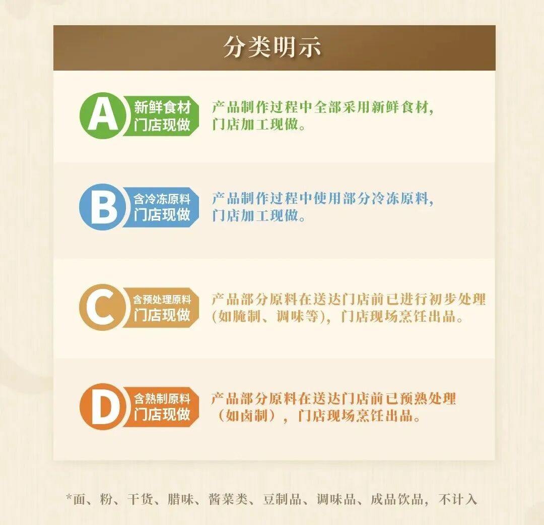 红餐网消息,今天(12月18日),太二酸菜鱼宣布全面启动透明菜单,根据菜品主材的鲜活属性和预处理程度,将菜品划分为ABCD四个类别。其中,A类代表“新鲜食材,门店现做”,B类含冷冻原料,C类会预处理原料,如提前腌制、调味等,D类含熟制原料,如卤味等。此外,面、干货、酱菜类等不纳入分类范畴。