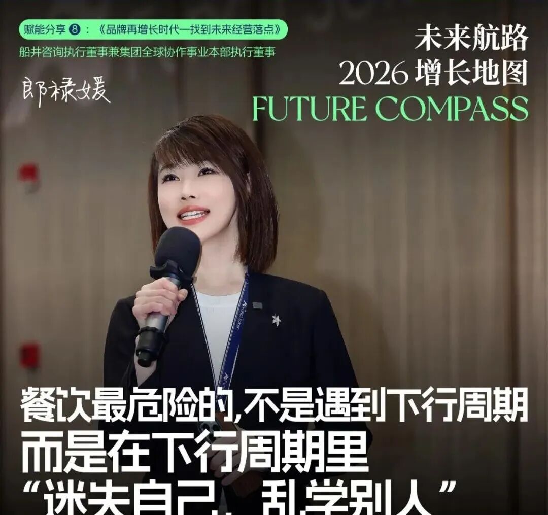 作为十年如一日的餐饮行业陪伴者,船井咨询执行董事兼集团全球协作事业本部执行董事郞禄媛,为在场的中国餐饮人梳理了行业当下的迷思与未来地图。基于她的深度洞察与一线观察,我们梳理出以下思考框架,希望能为正在前行的你,绘制一幅兼具远见洞察与人文温度的2026经营增长地图。