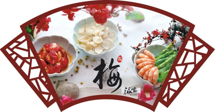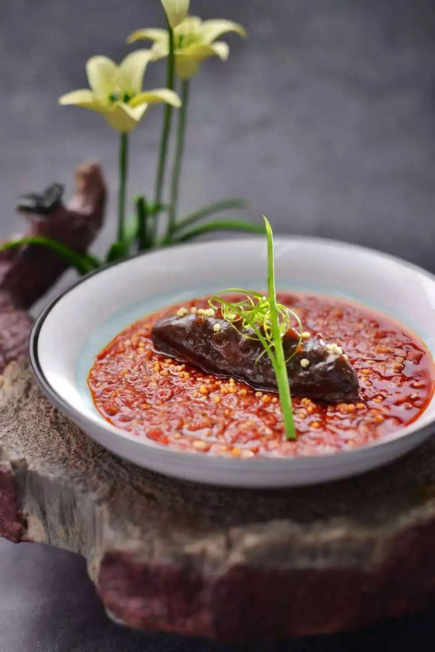 前菜“岁寒三友”,以梅花做凉菜;主菜“深骨幽香”,用兰花汁腌牛排;另一道主菜“鱼游翠竹”,用重庆的方竹笋烧酸菜鱼;最后的甜品“金风送爽”,则以炸菊花入冰粉。