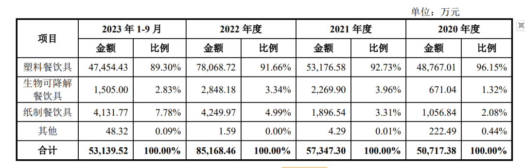 而昌亚股份的产品结构单一,业绩高度依赖塑料制品,产品也以 PP、PS等塑胶原料为主。2020年、2021年、2022年及2023年前三季度,该公司约有9成的营收来自塑料餐饮具,而在生物可降解餐饮具上的布局显得迟缓,营收占比分别为1.32%、3.96%、3.34%、2.83%。