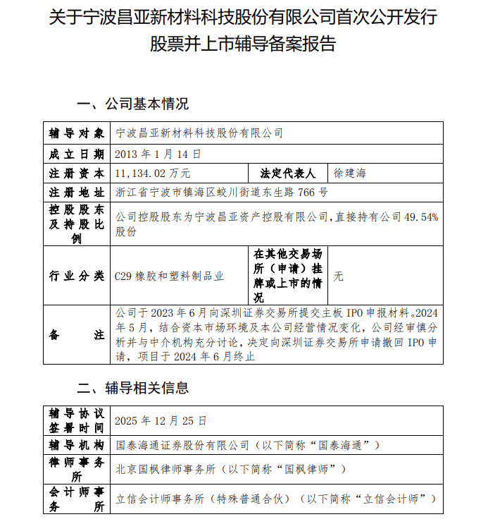 近日,宁波昌亚新材料科技股份有限公司(下称“昌亚股份”)提交的公开发行股票并上市辅导备案的申请,被宁波证监局受理,备案时间为2025年12月29日。