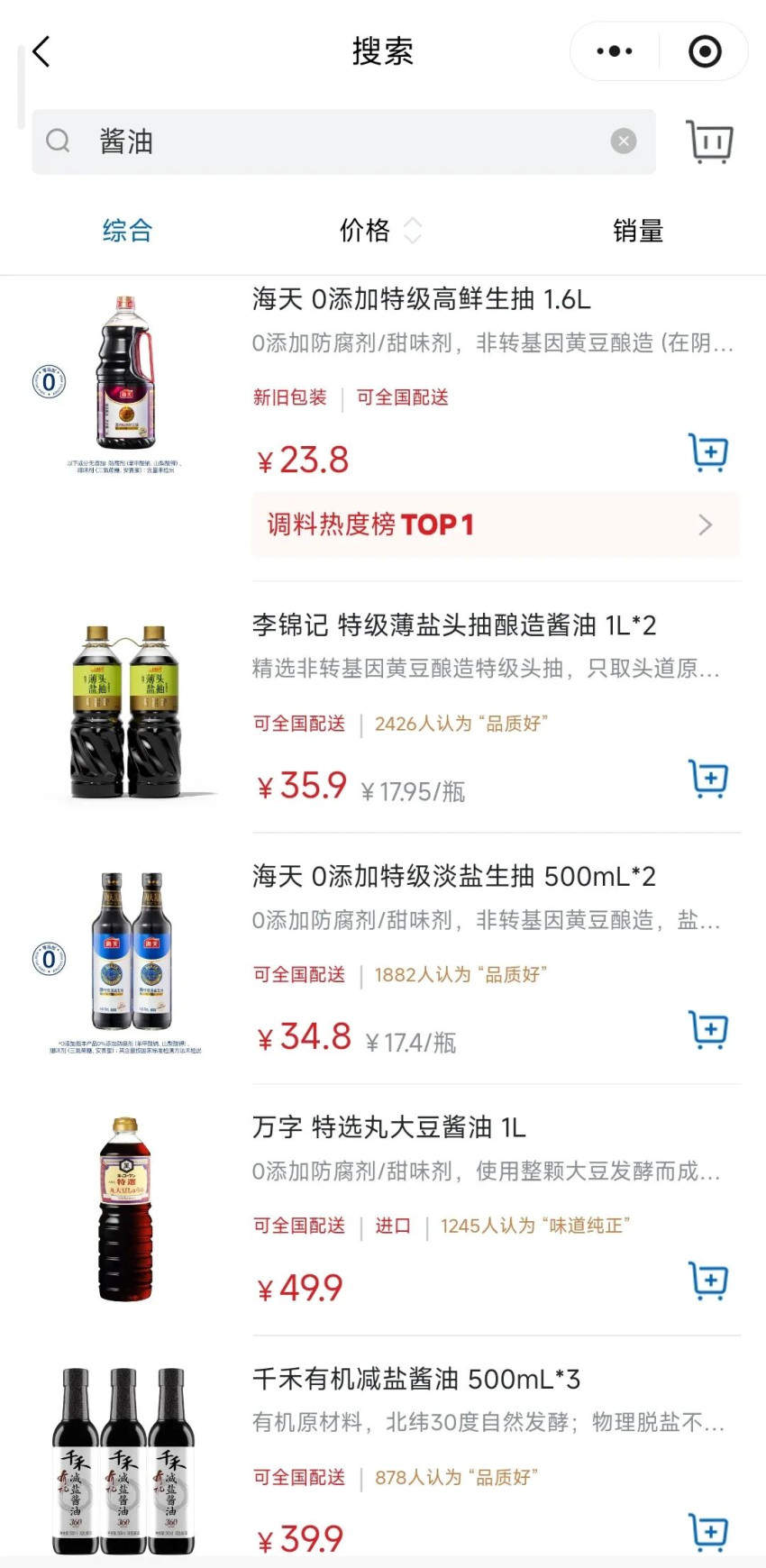 此外,线下渠道进入“货找人”阶段,以山姆为代表的仓储会员店为品牌先筛选出一批注重生活品质、购买力高的中产用户,并提供渠道背书,海天味业、李锦记、千禾味业先后入驻山姆。千禾味业还与沃尔玛自有品牌“沃集鲜”合作推出了黑豆酿造生抽、减盐酿造生抽、头道生抽等调味品。