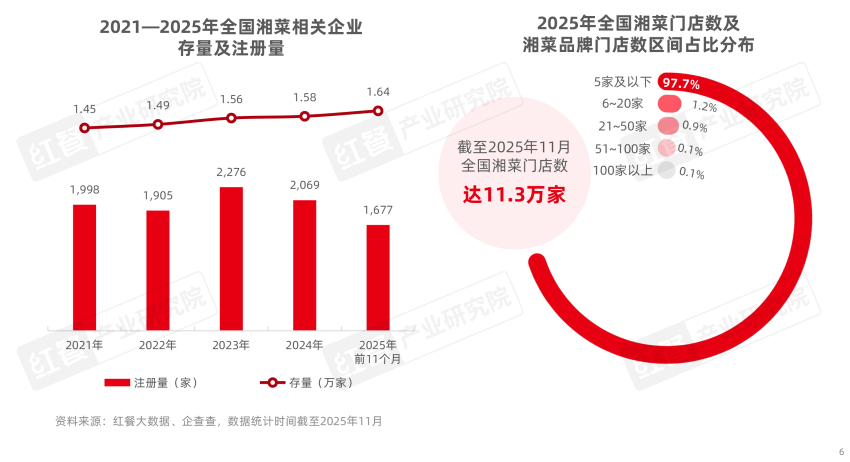 另据红餐大数据,2025年全国湘菜市场规模预计突破1100亿元,整体表现出上涨趋势。在门店规模方面,截至2025年11月,全国湘菜门店总数达到11.3万家。值得一提的是,经过多年的市场沉淀与发展,湘菜赛道已涌现出一批具备一定规模的实力连锁品牌。